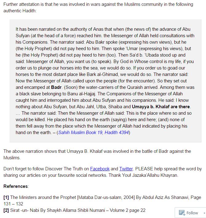 As it is, the best proof that Discover the Truth is being less than truthful about the reason for Umaiya's slaughter comes from the very sahih hadith they quote.